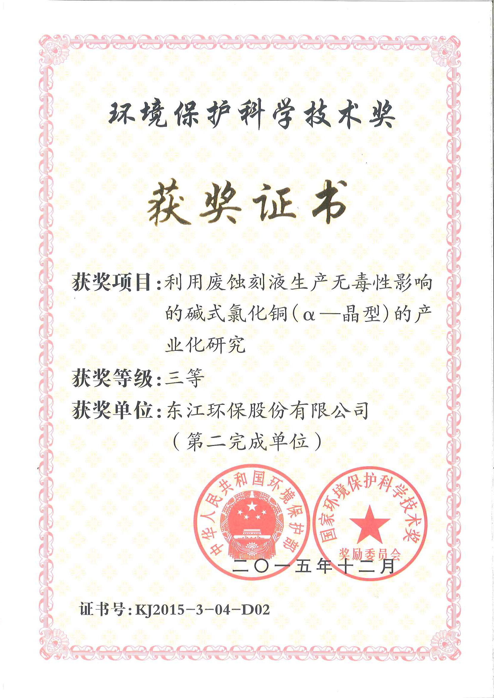 2015年12月 環(huán)境保護科學技術獎三等獎【利用蝕刻液生產無毒性影響的堿式氯化銅(α-晶型)的產業(yè)化研究】