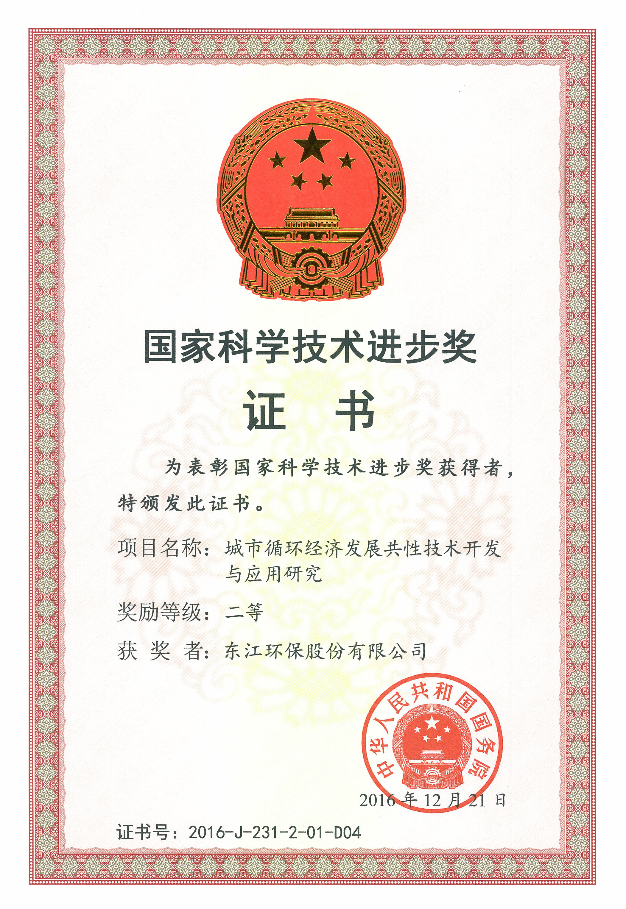 2016年12月 國家科學技術進步獎二等獎(城市循環(huán)經濟發(fā)展技術開發(fā)與應用研究)