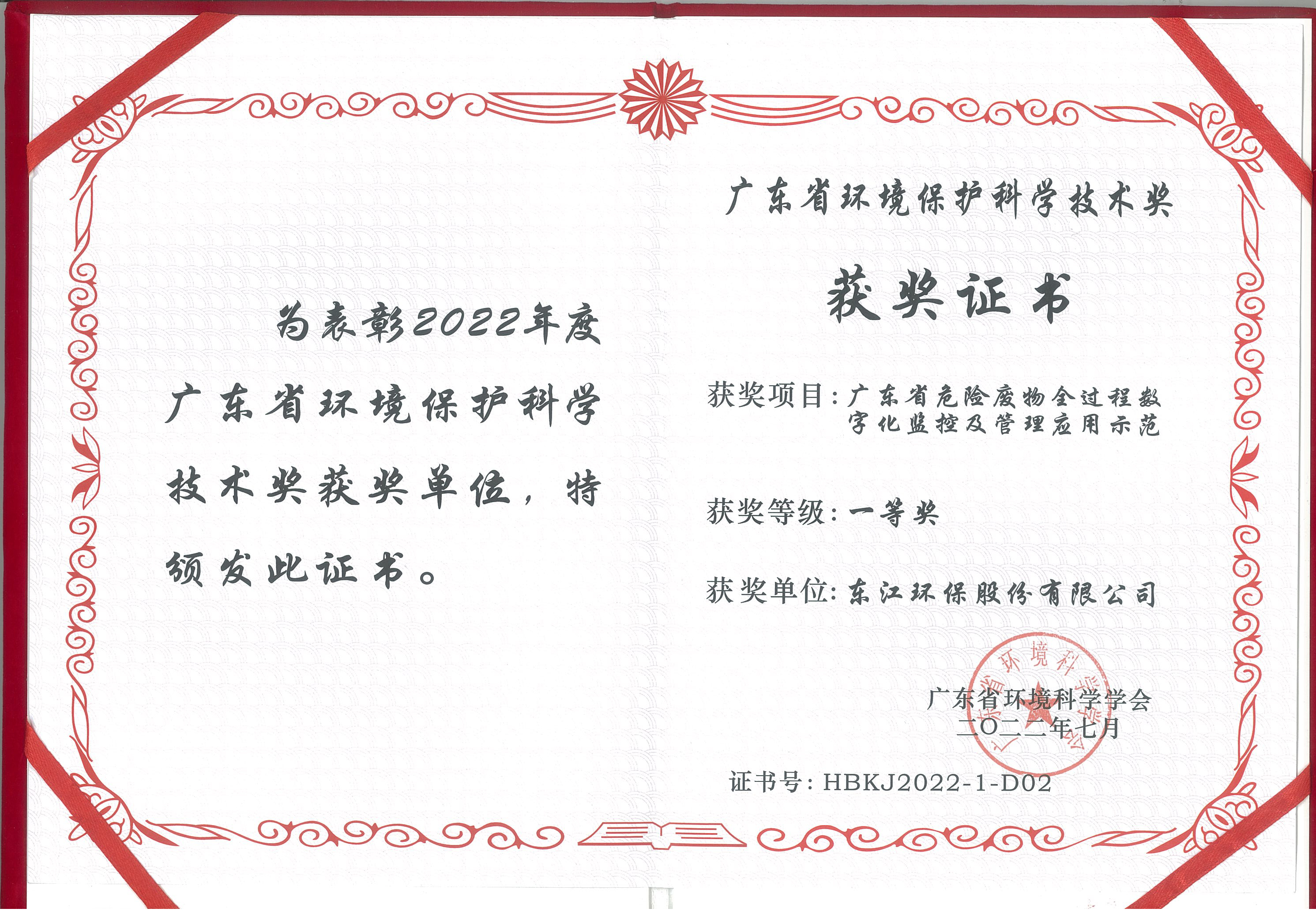 2022年7月 廣東省環(huán)境保護科學技術獎一等獎(廣東省危險廢物全過程數字化監(jiān)控及管理應用)