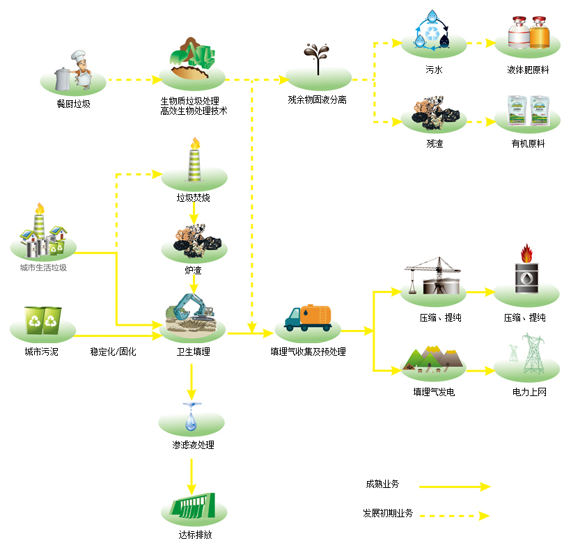 東江環保所從事的市政廢物處理業務包括市政廢物的處理處置和再生能源利用,主要是對城市生活垃圾進行清運和衛生填埋以及生活垃圾填埋滲濾液進行處理達標排放;利用生活垃圾填埋場所產生的填埋氣進行發電。此外,填埋氣發電項目和公司聯合投資的煤礦乏風減排項目可減少溫室氣體的排放,符合《京都議定書》規定的清潔發展機制,項目經聯合國CDM執行理事會批準后,二氧化碳核準減排量可在國際市場交易。